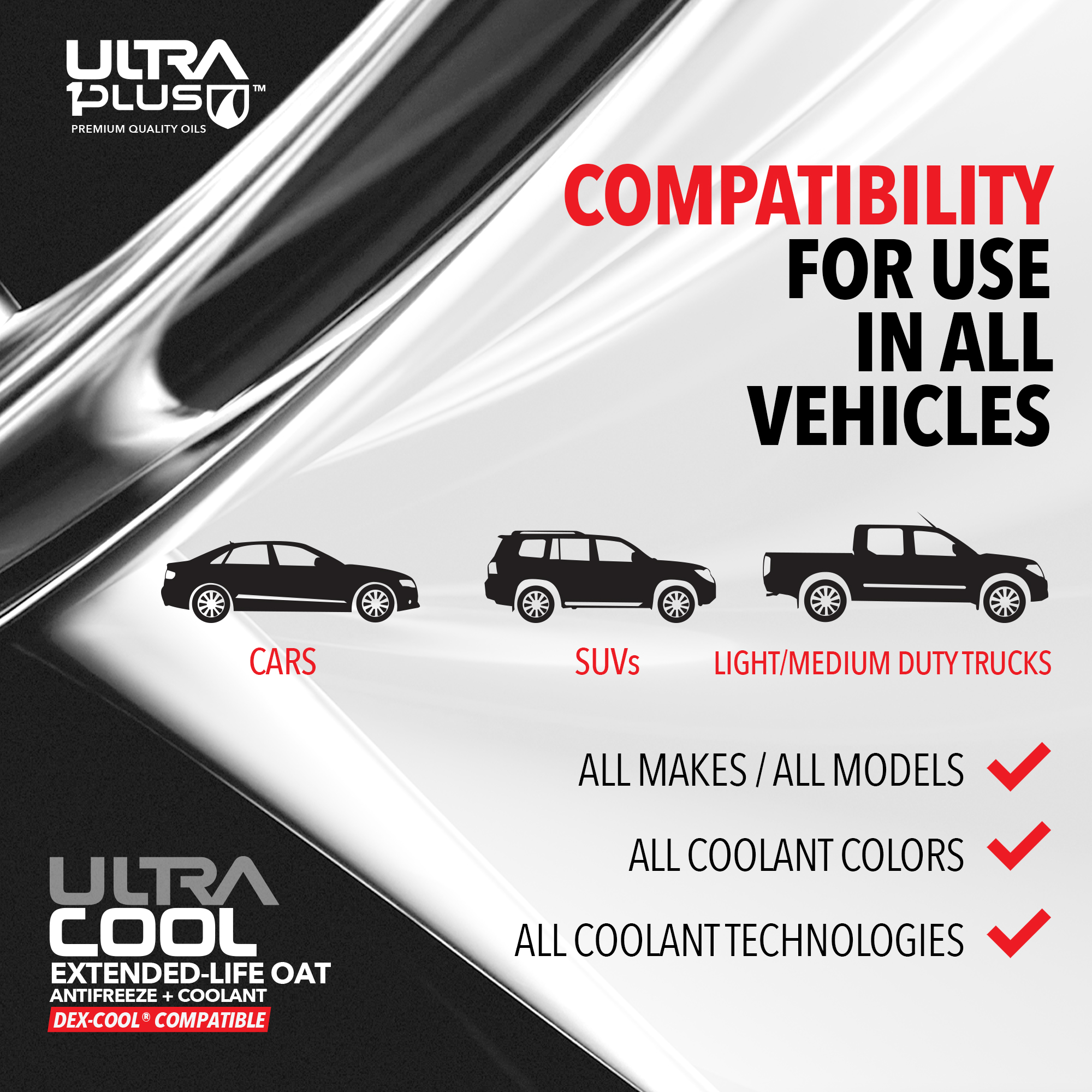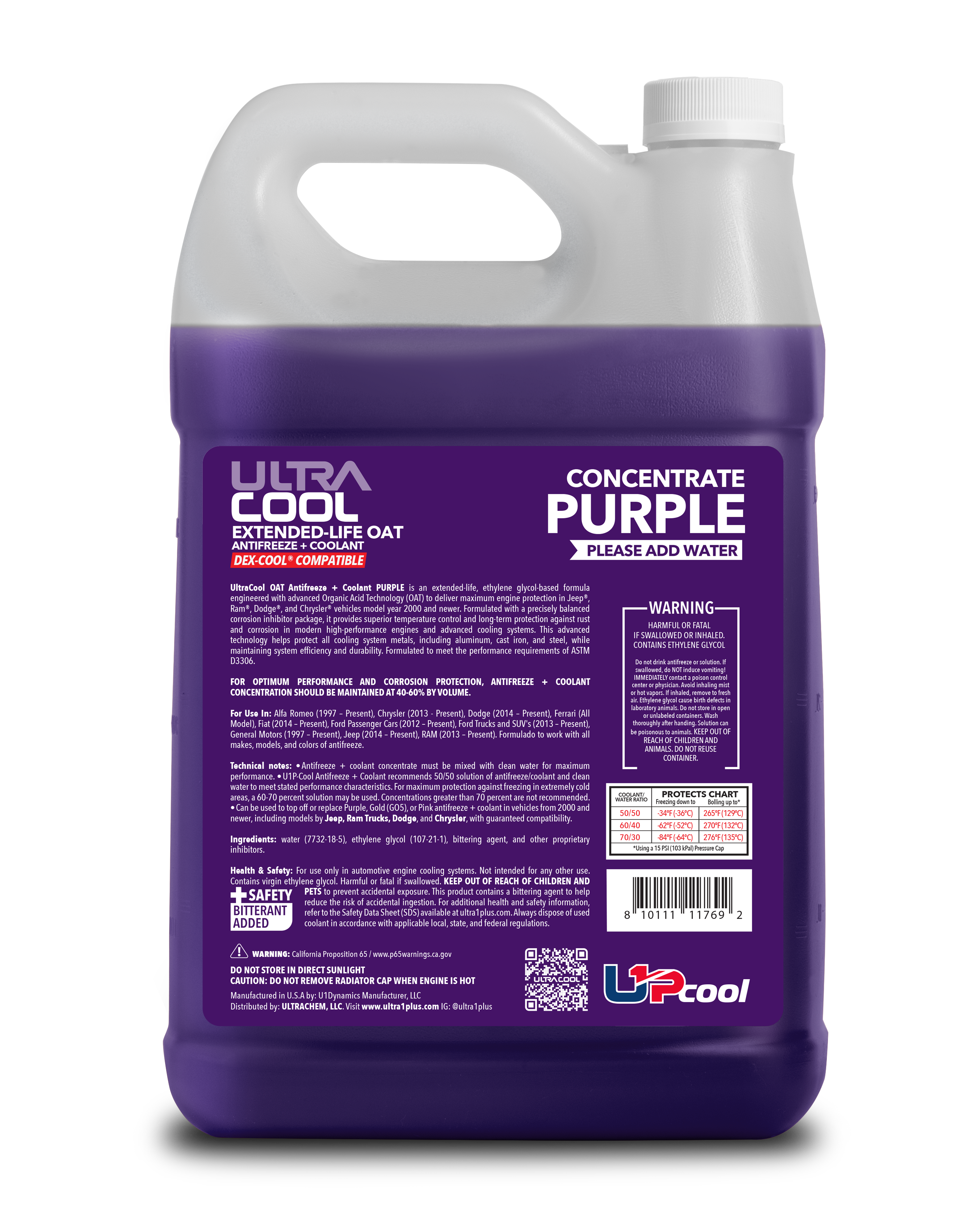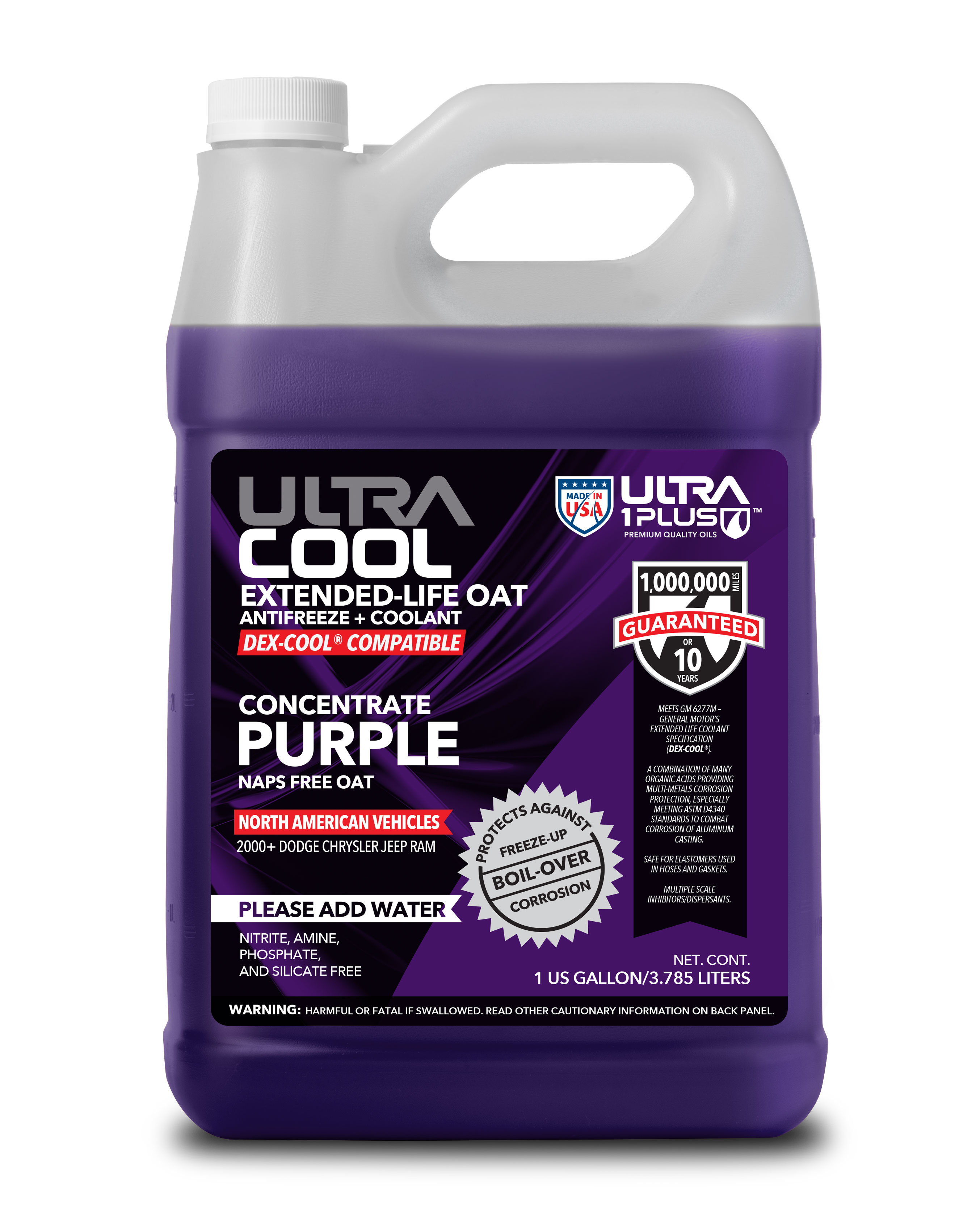 Ultra1Plus OAT Antifreeze + Coolant PURPLE is an extended-life, ethylene glycol-based formula engineered with advanced Organic Acid Technology (OAT) to provide maximum engine protection for Jeep, RAM, Dodge, and Chrysler vehicles from model year 2000 and newer. Formulated with a precisely balanced corrosion inhibitor package, it offers superior temperature control and long-term protection against rush and corrosion in modern high-performance engines and advanced cooling systems. This advanced technology safeguards all cooling system metals, including aluminum, cast iron, and steel, while maintaining system efficiency and durability. UltraCool OAT meets the performance requiments of ASTM D3306.