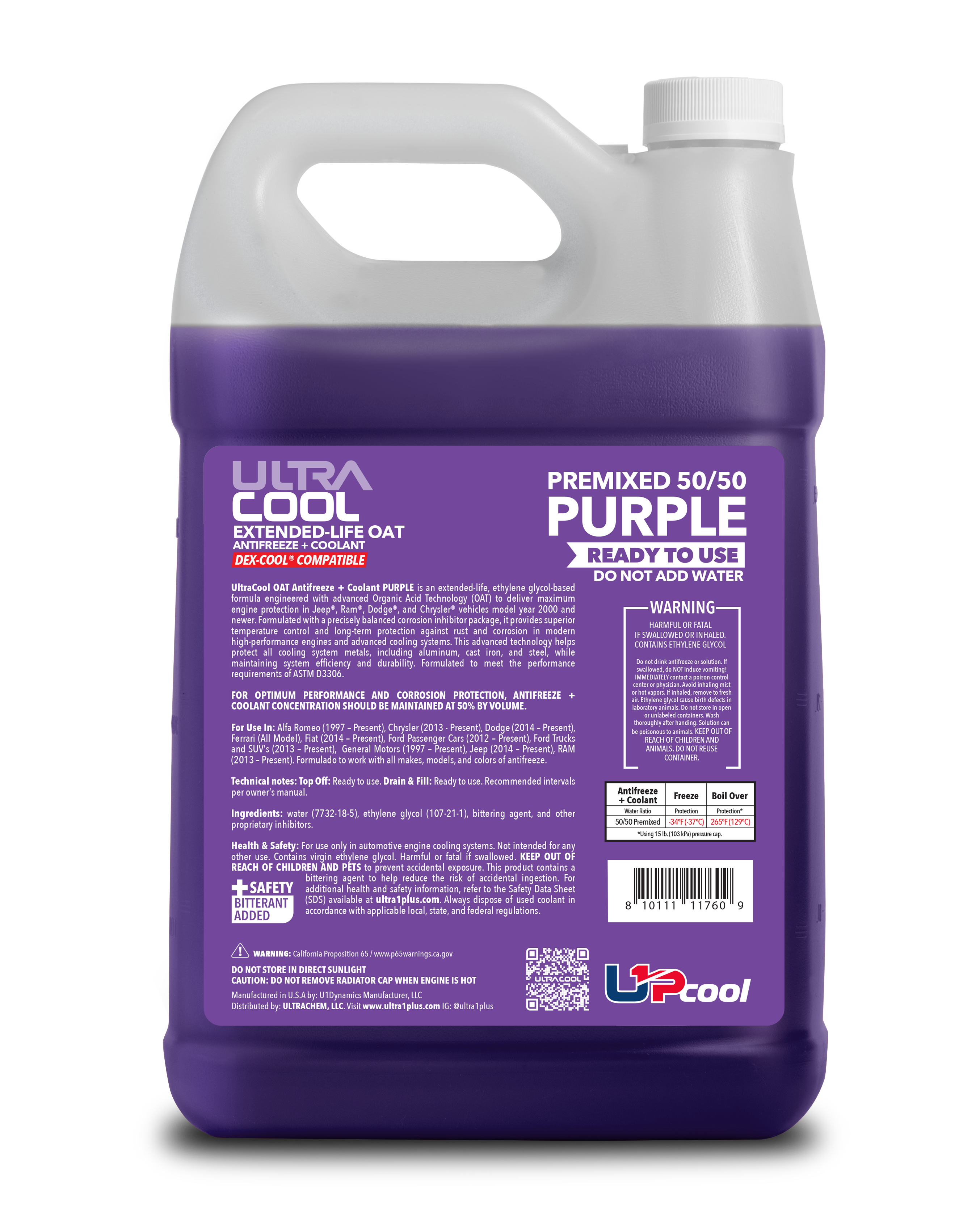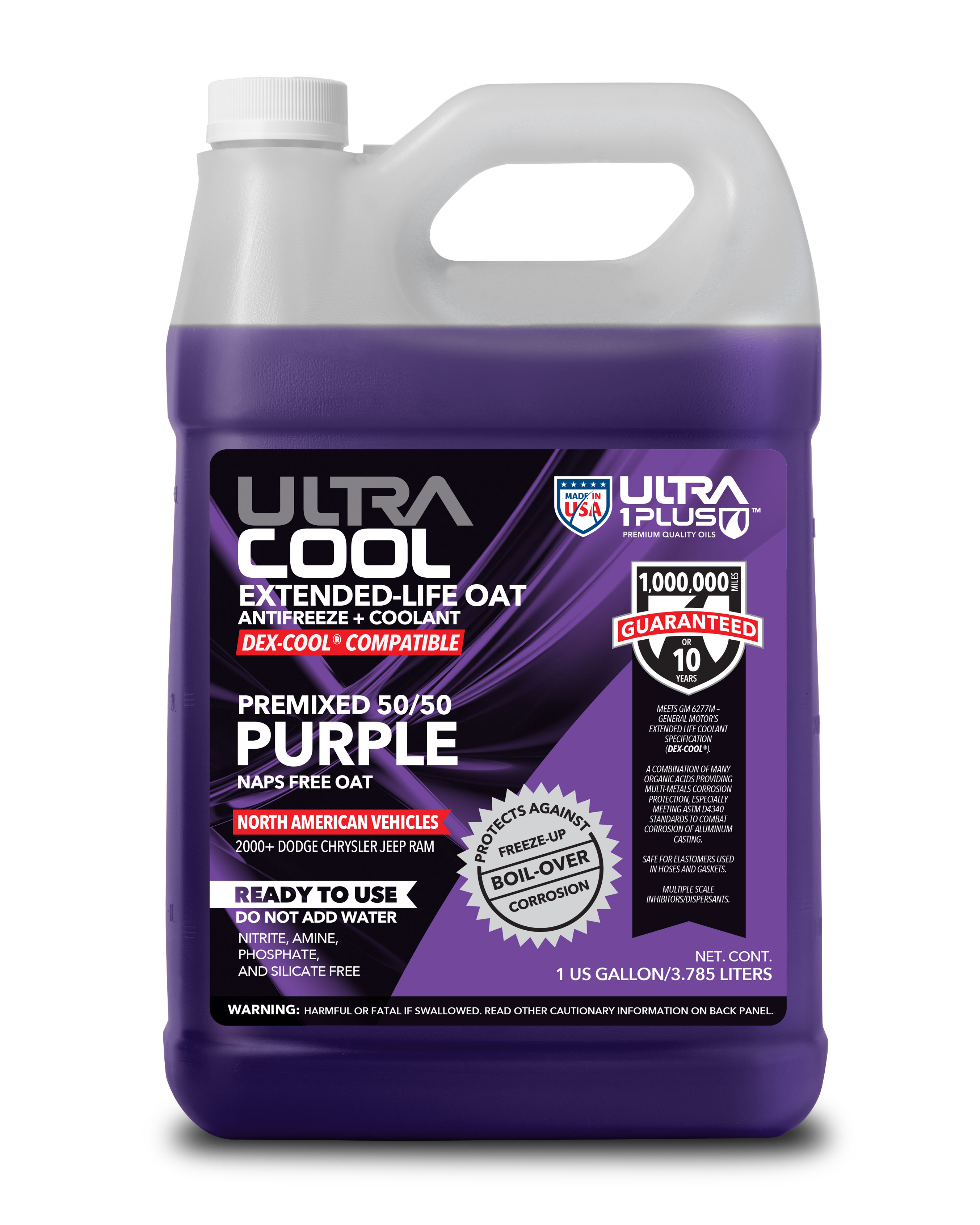 Ultra1Plus OAT Antifreeze + Coolant PURPLE is an extended-life, ethylene glycol-based formula engineered with advanced Organic Acid Technology (OAT) to provide maximum engine protection for Jeep, RAM, Dodge, and Chrysler vehicles from model year 2000 and newer. Formulated with a precisely balanced corrosion inhibitor package, it offers superior temperature control and long-term protection against rush and corrosion in modern high-performance engines and advanced cooling systems. This advanced technology safeguards all cooling system metals, including aluminum, cast iron, and steel, while maintaining system efficiency and durability. UltraCool OAT meets the performance requiments of ASTM D3306.