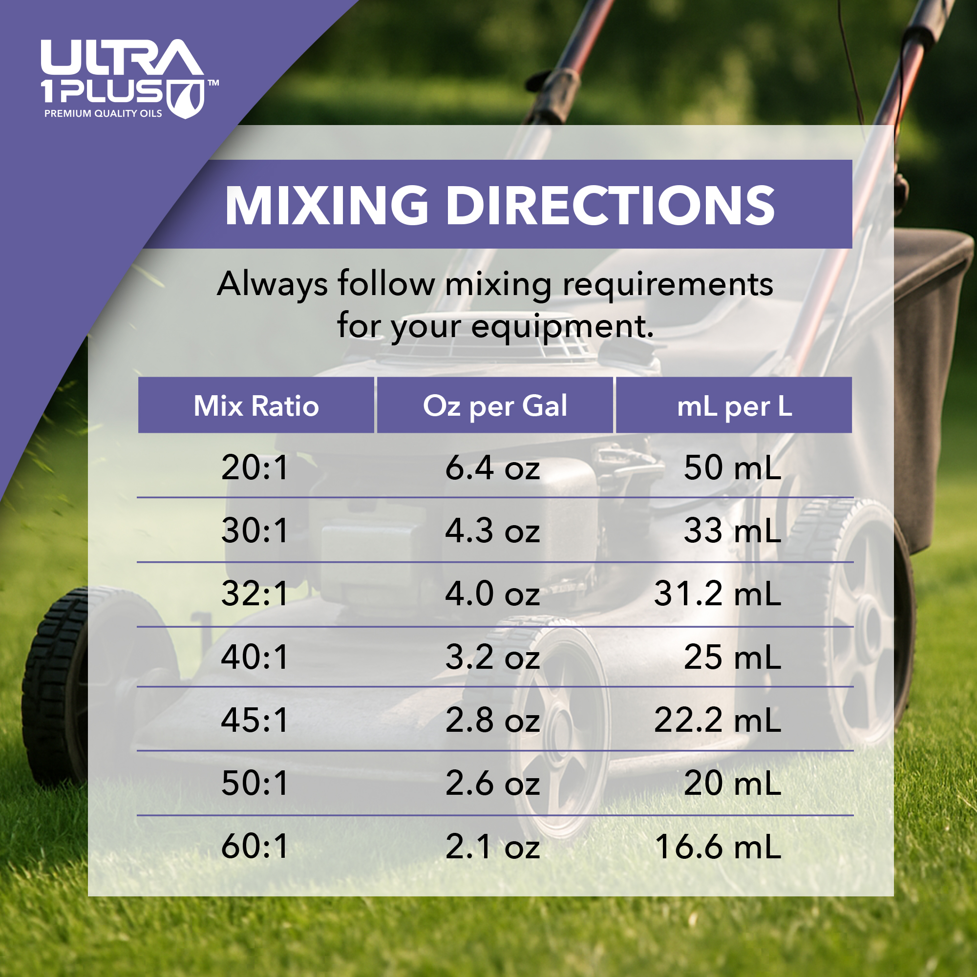 Always follow the dilution ratio and oil performance level recommended in your engine's owner's manual.